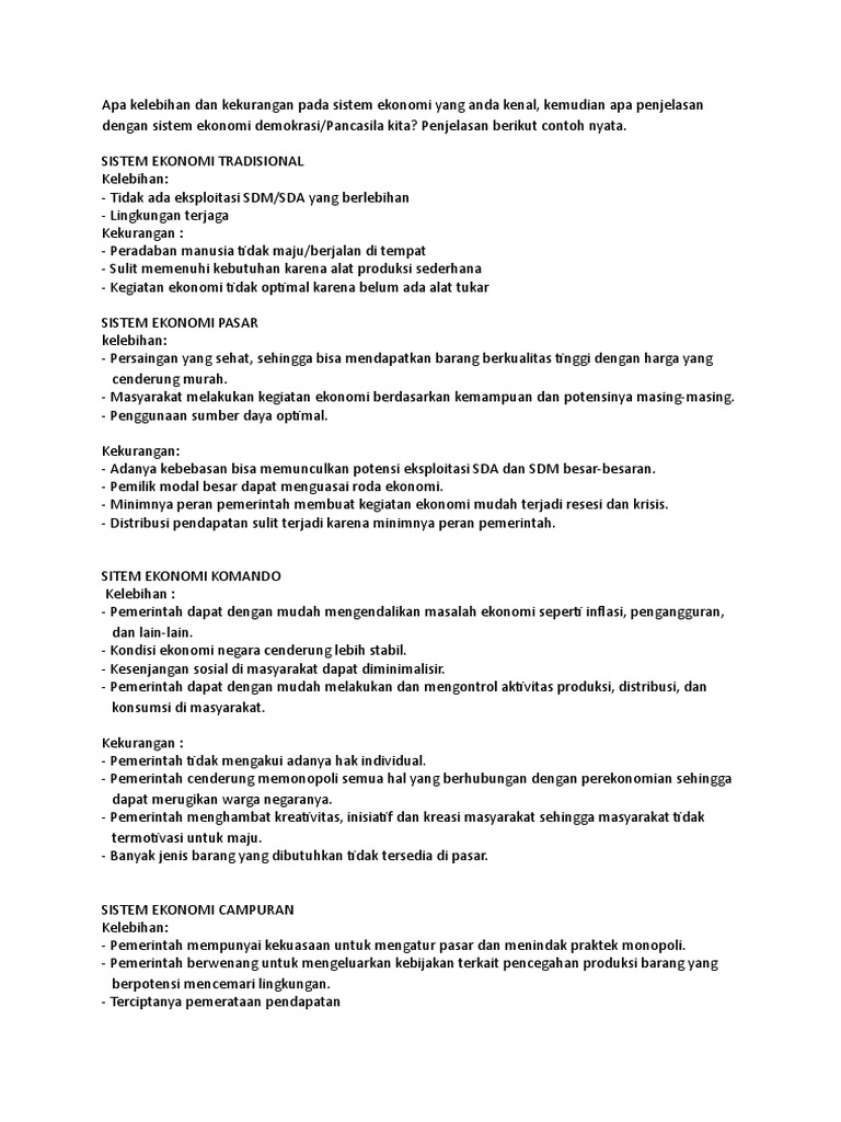 Itulah ulasan tentang sistem ekonomi demokrasi: Sistem ekonomi pancasila, atau disebut dengan sistem ekonomi demokrasi merupakan sistem ekonomi yang dibangun berdasarkan nilai dan moral yang ada pada pancasila. Hak milik individual diakui oleh negara selama pemanfaatannya tidak bertentangan dengan kepentingian umum. 3) kebutuhan masyarakat terjamin karena negara menjamin kebutuhan hajat hidup orang banyak. Kelebihan dan kekurangan demokrasi terpimpin. Sistem ekonomi komando merupakan satu bentuk sistem ekonomi. Berikut merupakan kelebihan dari sistem demokrasi ekonomi : Segala kegiatan dan juga beberapa masalah perekonomian dikendalikan pemerintah sehingga dalam hal ini pemerintah akan mudah melakukan suatu pengawasan terhadap jalannya kehidupan perekonomian. Sistem ekonomi sendiri ada 4 macam yaitu sistem ekonomi rtradisional, sistem ekonomi terpusat (sosialis), sistem kelebihan sistem ekonomi kapitalis/liberal. Tujuan adanya sistem pemerintahan ini adalah untuk. Sistem demokrasi ekonomi adalah suatu sistem perekonomian nasional yang merupakan perwujudan dari falsafah pancasila dan uud 1945 yang berasaskan kekeluargaan dan kegotongroyongan dari, oleh, dan untuk rakyat di bawah pimpinan dan pengawasan pemerintah. Sistem ekonomi demokrasi merupakan sistem ekonomi yang hampir sama dengan sistem ekonomi campuran, dimana pemerintah mempunyai kuasa atas kegiatan ekonomi namun tetap memberikan runag yang terbatas bagi materi tentang kekurangan dan kelebihan sistem demokrasi ekonomi. Pernah dengar arab spring yang terjadi tahun 2011 lalu?